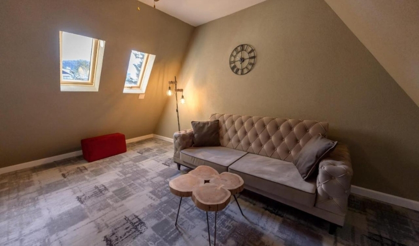 Pentru o experiență relaxantă, oaspeții au acces la o cadă cu hidromasaj, care completează perfect atmosfera de rafinament.